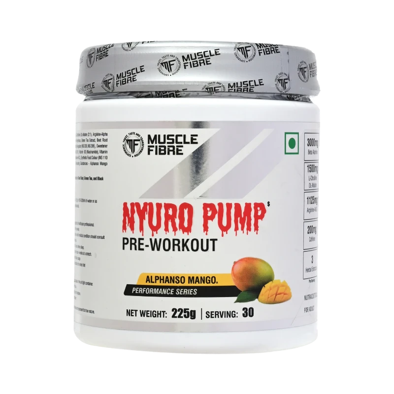 Muscle Fibre Nyuro Pump Pre-Workout is a powerful energy, focus, and pump-enhancing formula designed to maximize workout performance. With a scientifically balanced blend of caffeine, beta-alanine, citrulline, and arginine, it helps deliver intense energy, improved blood flow, and enhanced endurance—allowing you to push harder and train longer.